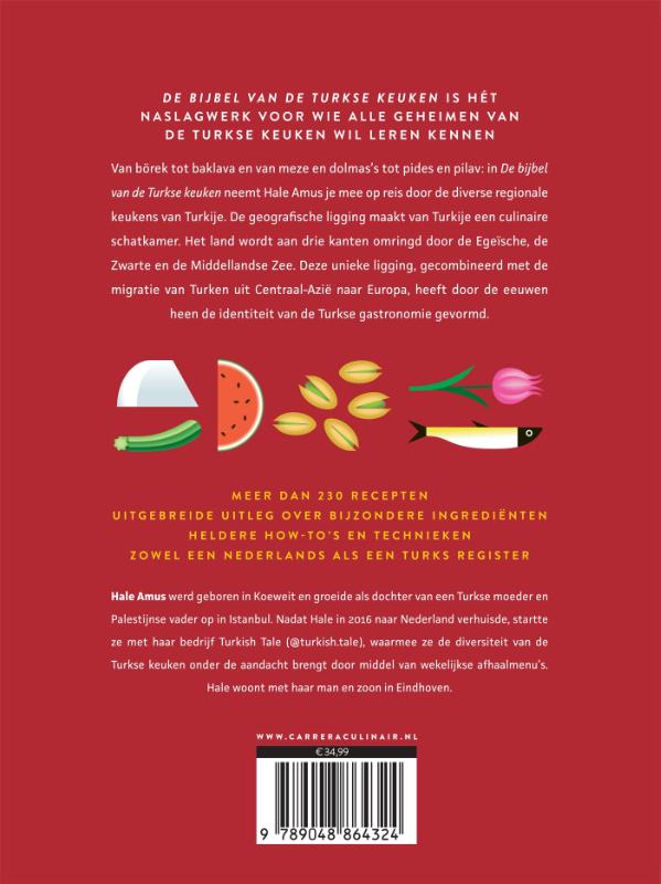 Van börek tot baklava en van meze en dolmas's en pilav: in De bijbel van de Turkse keuken neemt Hale Amus je mee op reis door de diverse regionale keukens van Turkije. De geografische ligging maakt van Turkije een culinaire schatkamer. Het land wordt aan drie kanten omringd door de Egeïsche, de Zwarte en de Middellandse Zee. Deze unieke ligging, gecombineerd met de migratie van Turken uit Centraal-Azië naar Europa, heeft door de eeuwen heen de identiteit van de Turkse gastronomie gevormd.
