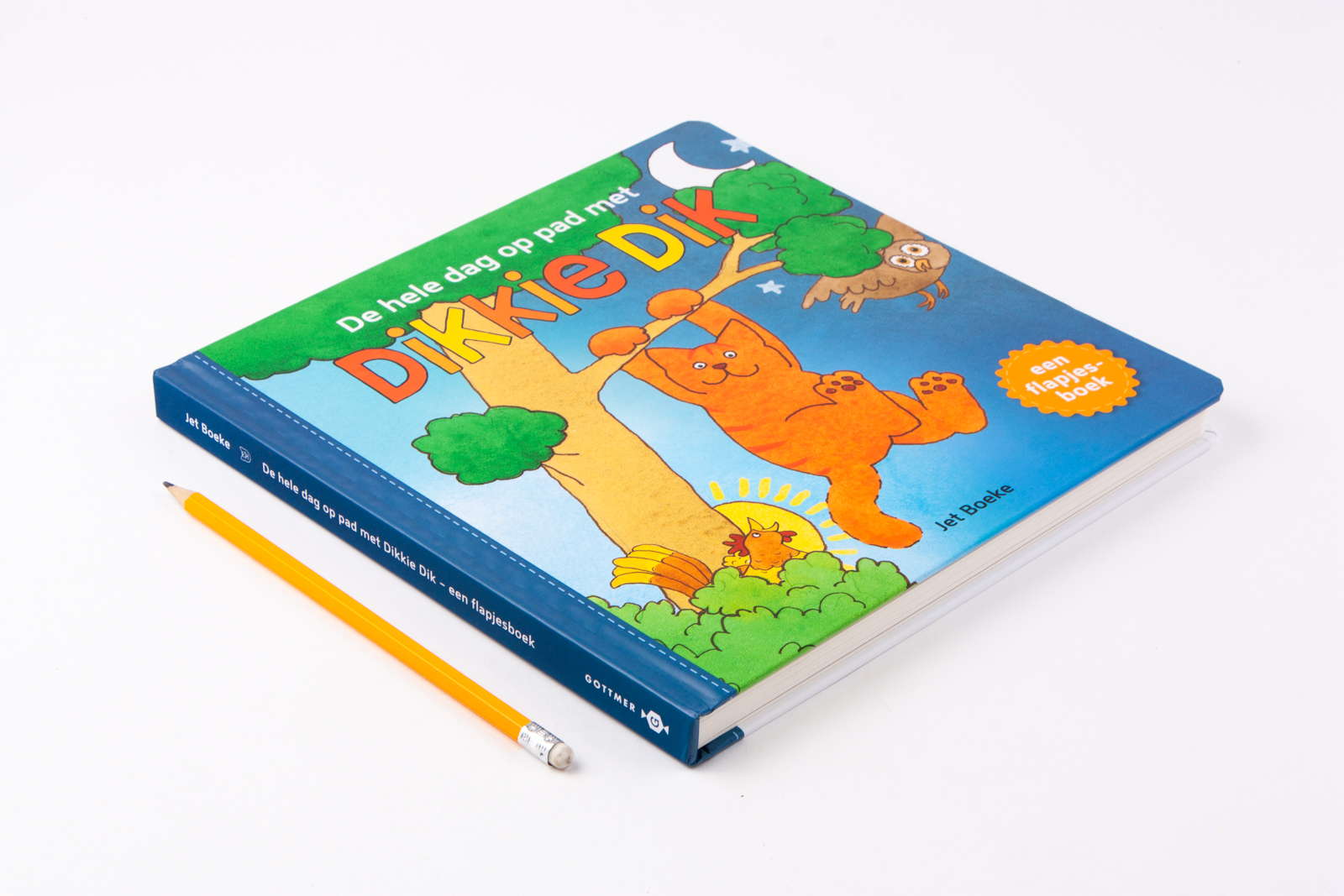 Dit stevige kartonboek over de geliefde oranje kater Dikkie Dik, 'De hele dag op pad met Dikkie Dik', gaat over dag en nacht en over alle dieren en dingen die je tegen kunt komen. Op elke pagina vind je grote flappen om nog meer van de wereld van Dikkie Dik achter te ontdekken. Dikkie Dik wordt zó vroeg wakker dat poes Muis nog slaapt. Daarom gaat hij maar alleen op pad. Dikkie Dik houdt van lekker struinen, net als andere katten. Maar vandaag gaat hij wel heel ver van huis. Zo ver, dat het onderweg al donker wordt en de maan opkomt. Maar dat vindt Dikkie Dik helemaal niet erg en eigenlijk juist wel leuk; 's nachts ziet de wereld er opeens heel anders uit en kom je dieren tegen die je overdag niet ziet. Wandel mee met Dikkie Dik en ontdek achter de flapjes welke dieren er overdag wakker zijn en welke juist 's nachts. Spelenderwijs komen dreumesen en peuters er zo achter wat het verschil is tussen de ochtend en de middag, de avond en de nacht. 's Ochtends kom je een haan en een vogeltje tegen, maar als de zon begint te zakken zie je misschien wel een hert. En als het écht laat wordt... dan gaat Dikkie Dik weer lekker slapen!