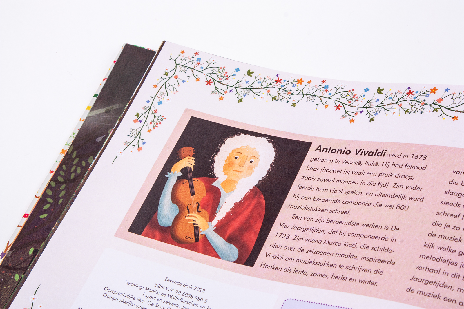 Volg van het lichte ochtendgloren tot de ijzige zonsondergang een meisje en haar hond. Ze reizen samen in één dag door de lente, zomer, herfst en winter. De illustraties kun je steeds opnieuw bekijken, er is zoveel op te zien. Op elke bladzijde staat een muzieknoot en als je daar op drukt… komt het seizoen in klank tot leven met muziek uit De vier jaargetijden van Vivaldi. Wat een verrassing! Geniet levendige tekenen en de prachtige muziek van Vivaldi in dit kijk, lees en luisterboek. Kennismaken met klassieke muziek was nog nooit zo leuk. Bekijk ook onze andere boeken met muziek in onze succesvolle reek Het verhalenorkest.