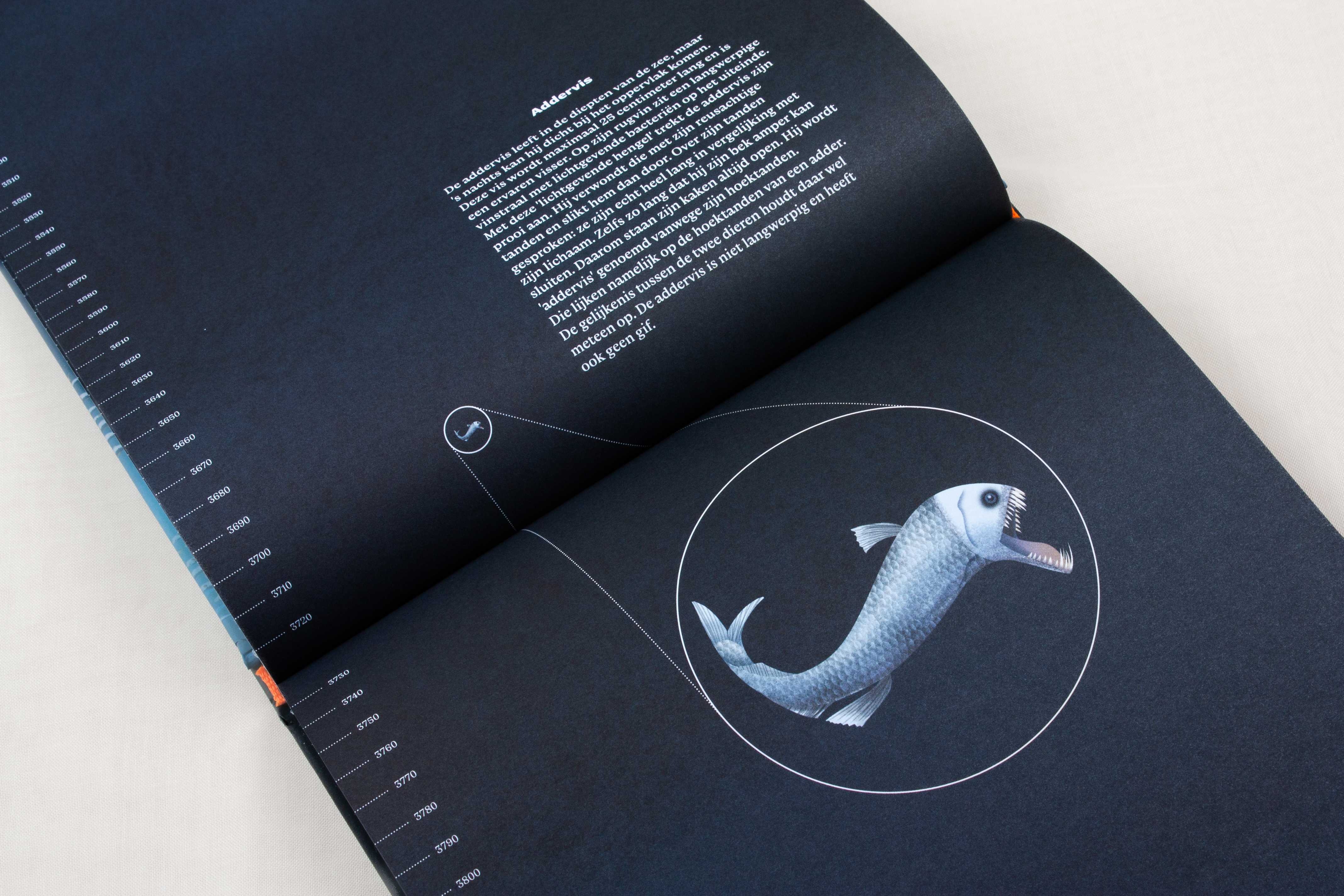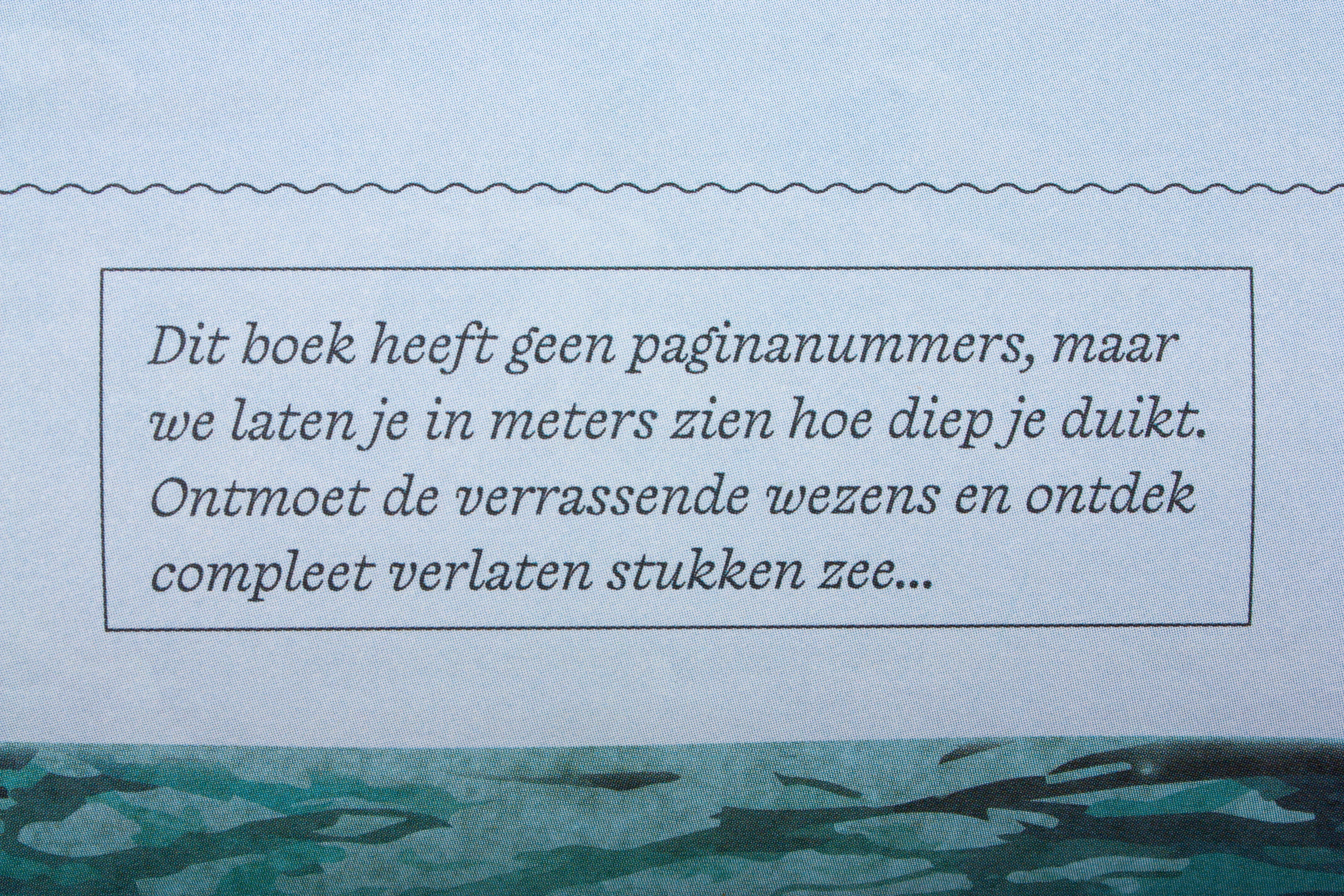 Bladerbare onderzeereis VERKEN DE ECOSYSTEMEN VAN DE ZEE EN LAAT JE STEEDS DIEPER MEE NAAR BENEDEN VOEREN DOOR DE BLADZIJDEN VAN DIT BOEK. Ga op onderzoek uit in de zee. Dit bijzondere boek neemt je mee naar beneden, steeds dieper en dieper de zee in. De liniaal aan de linkerkant van elke pagina is je houvast op weg naar de diepste, donkere bodem van de zee. Je reist door zones waar het wemelt van het leven en komt op plekken waar het vooral stil en eenzaam is. Wat kom je allemaal tegen? Van pinguïns en vissen, onderzeeërs en reuzeninktvissen tot de vreemde wezens die in het 11 kilometer diepe Marianentrog leven. Blader jezelf de diepte in! Ben je er klaar voor? Trek je duikpak aan en dan kan deze ongelooflijke reis beginnen.