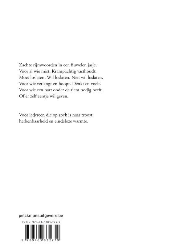 Zachte rijmwoorden in een fluwelen jasje. Voor al wie mist. Krampachtig vasthoudt. Moet loslaten. Wil loslaten. Niet wil loslaten. Voor wie verlangt en hoopt. Denkt en voelt. Voor wie een hart onder de riem nodig heeft. Of er zelf eentje wil geven. Voor iedereen die op zoek is n... Meer