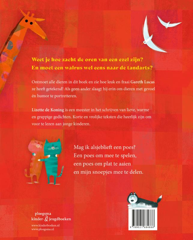 Mag ik alsjeblieft een poes?Een poes om mee te spelen,een poes om plat te aaienen mijn snoepjes mee te delen. De bekende illustrator Gareth Lucas selecteerde zijn mooiste dierentekeningen voor dit innemende versjesboek. Als geen ander slaagt hij erin om dieren met gevoel én humor te tekenen. Neem bijvoorbeeld de groep beren die je aankijkt alsof er net een onverwachte foto wordt genomen... Voeg daarbij de rijmende, lieve en grappige versjes van Lizette de Koning en je hebt iets geweldigs in handen. Zij is een meester in het schrijven van lichte en geestige teksten die heerlijk zijn om voor te lezen. Een boek dat gekoesterd gaat worden in vele kinderkamers!
