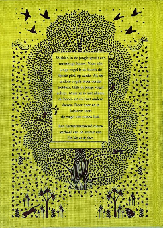 Midden in de jungle groeit een torenhoge boom. Elke zomer vangt de boom een zwerm vogels, die het droge seizoen zingend in zijn takken doorbrengen. Voor een jonge vogel is de boom de fijnste plek op aarde, elke tak is zo vertrouwd als haar eigen veren. Maar als de andere vogels weer verder trekken is de jonge vogel nog niet klaar de boom te verlaten. Ze blijft achter maar is niet alleen; de boom zit vol met andere dieren. Door naar hen te luisteren leert de vogel een nieuw lied. Geniet met wijd opengesperde ogen van de unieke, grafische illustraties van Coralie Bickfort-Smith. De kleuren en vormen spatten van iedere bladzijde af. De tekst is dromerig, vol gevoel en leest haast als een gedicht. Door de prachtige vertaling van Jan Rot klinkt Het lied van de boom in onze taal haast nog mooier.