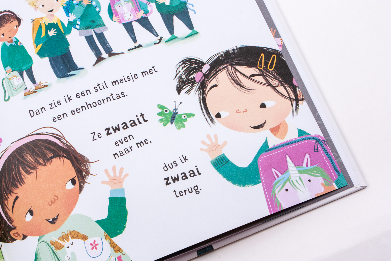 Een licht humoristisch, hartverwarmend verhaal voor jonge kinderen dat een verlegen meisje volgt dat probeert een manier te vinden waarop ze kan omgaan met nieuwe situaties. Met gaatjes in de bladzijden die verlegenheid uitleggen - zoals een halfopen deur waardoor het meisje naar een feestje kijkt of het schoolplein waar ze zich verstopt - en het meisje leert hoe de vlinders in haar buik haar kunnen helpen bij het vinden van nieuwe vriendjes. Drukke, prachtige illustraties met herkenbare personages, van de getalenteerde Åsa Gilland.