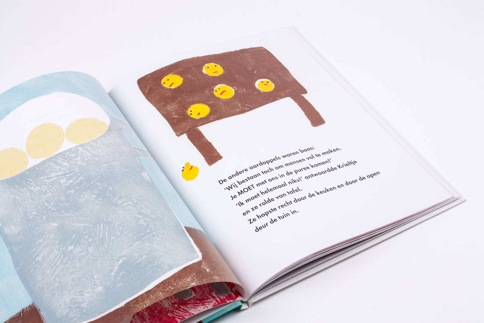 Elke aardappel weet waarom hij bestaat: om te worden gegeten! Maar Krieltje heeft andere ideeën en ze springt van de tafel naar buiten. ‘Wat ben jij?’ vraagt ze aan iedereen die ze tegenkomt. ‘En waarom ben jij op aarde?’ Roodborstje, worm, hommel, bloem en steen; ze geven allemaal een ander antwoord. Je kunt dus ook gewoon ‘zijn’ en van de zon genieten! Krieltje denkt diep na en valt in slaap en droomt. Als ze weer wakker wordt, is ze groot, zit ze vast in de grond, én heeft ze kleintjes gekregen. Waarvan er misschien wel één wegloopt om… astronaut te worden?