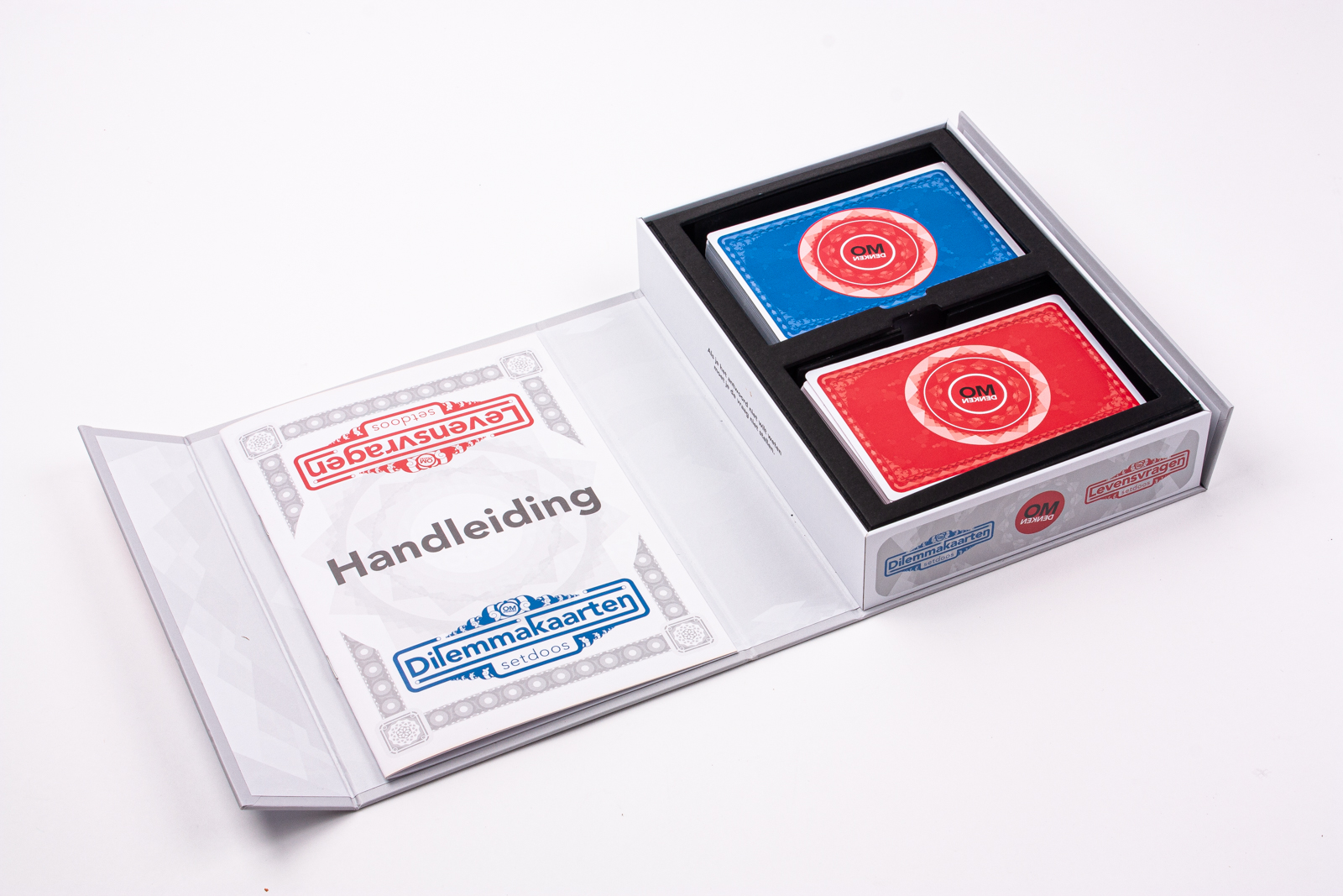 Deze doos bevat twee spellen met beide 78 kaarten: Levensvragen en Dilemmakaarten. Je zou ze apart van elkaar kunnen spelen, maar het leuke aan de twee spellen bij elkaar is dat ze samen nóg leuker zijn. Deze twee-in-één-doosje-set is dus bedoeld om uitgebreidere spelvormen mee te spelen. Elk antwoord past namelijk precies op elke vraag. En dat leidt tot ongekende mogelijkheden. Je kunt deze spellen alleen, met z’n tweeën, of met een grote groep mensen spelen. Wat ons betreft: laat je verrassen door de soms shockerende, verrassende of onthullende informatie die het spel oplevert. Over je medespelers, maar misschien nog wel meer over jezelf. Het leven is een bizar avontuur. In deze set vind je 78 dilemmakaarten met antwoorden als "Ja, het zal het beste in je naar boven halen", "Nee, dat weet je zelf toch ook al lang?" en "Ja, maar hou het speels". Daarnaast ook 78 levensvragen met vragen als "Zal ik stoppen mezelf te bewijzen?", "Zal ik pas bang zijn als het zover is?" en "Zal ik eindelijk eens de handrem eraf halen?". Naast de twee spellen zit er ook een handleiding met diverse spelvormen in de doos.