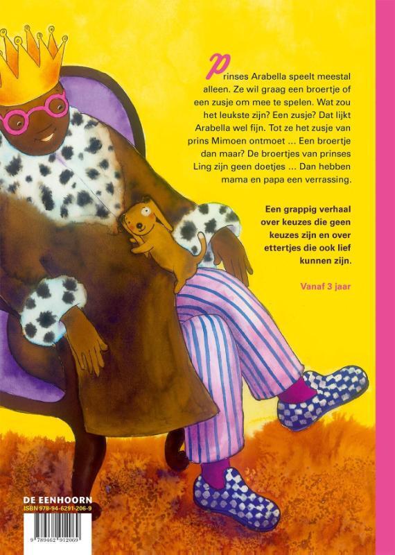 - Populaire prinsessen-reeks - Ideaal geschenk bij de geboorte van een broertje of zusje - Zoals steeds met verrassende ontknoping Een grappig verhaal over de voor- en nadelen van broertjes en zusjes. Prinses Arabella wil graag een broertje of zusje om mee te spelen. Wat zou het leukste zijn? Een zusje lijkt Arabella wel fijn. Tot ze het zusje van prins Mimoen ontmoet. Een broertje dan maar? De broertjes van prinses Ling zijn geen doetjes. Misschien moet Arabella een oudere zus vragen? Dan hebben mama en papa een verrassing.