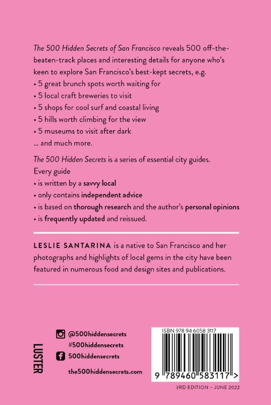 NEW UPDATED EDITION JUNE 2022 What are the best burger joints in San Francisco? Which local craft breweries are worth visiting? Where should you go to find the coolest surf gear? The 500 Hidden Secrets of San Francisco is the perfect guide for anyone who’s keen to explore the city’s best-kept secrets. It guides the reader to the places not typically included in tourist guides. Like a secret fairy door in Golden Gate Park or the truly steepest hills in the city. At the same time, it also lists fantastic places frequented by San Francisco residents, like where to shop for local goods and antiques, or where to go for a fabulous brunch and the best craft cocktails in the city. Packed with hundreds of places to go, things to do, and good-to-know facts about the city, The 500 Hidden Secrets of San Francisco will help you make the most of your visit to one of the United States’ coolest towns. Leslie Santarina lives and works in San Francisco. She is a contributor to numerous design sites and publications. In The 500 Hidden Secrets of San Francisco Leslie tells you where to go in her hometown.
